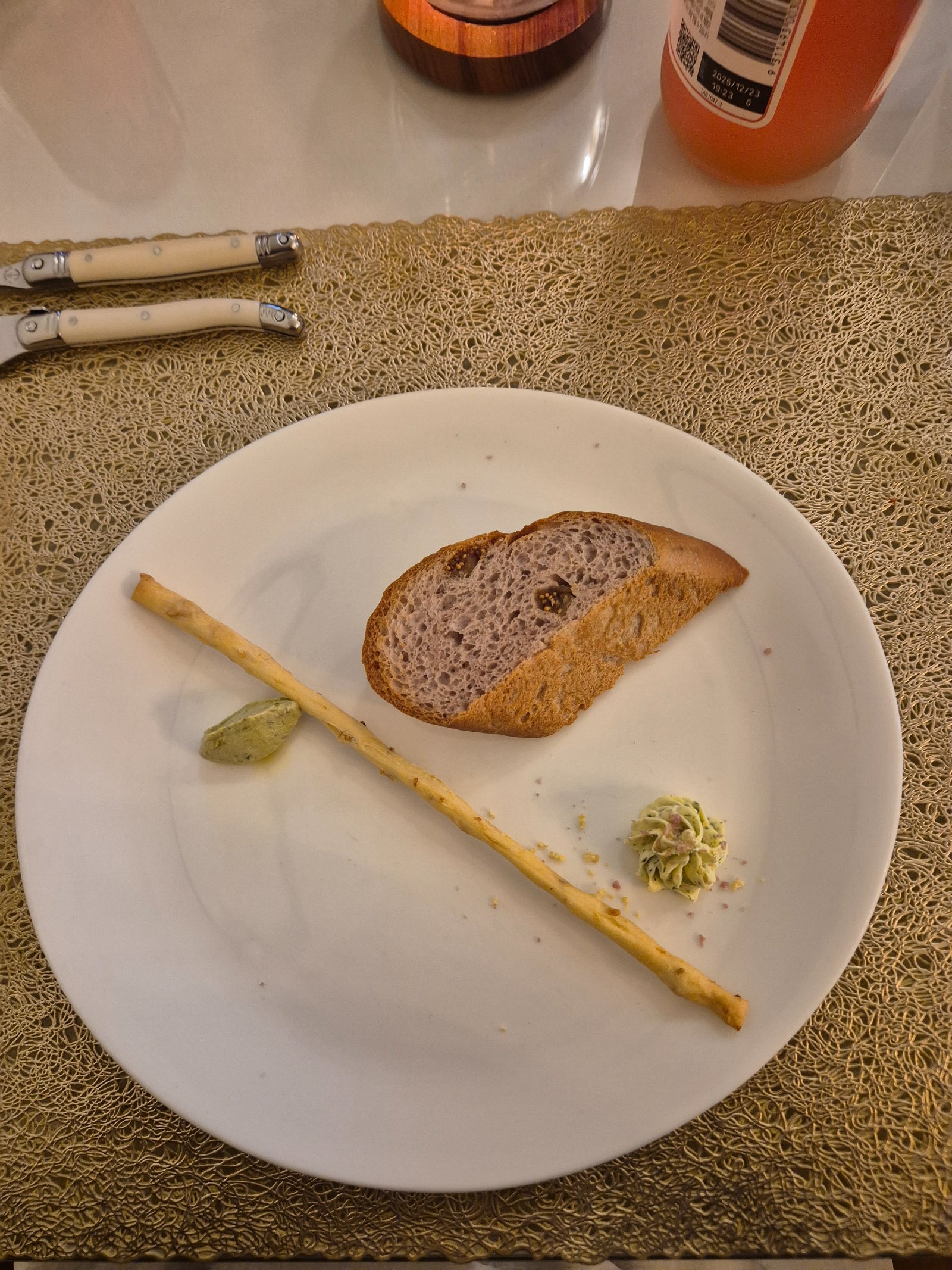 따뜻하게 구운 빵이 나왔어요. 겉은 바삭하고 속은 부드러운 식감이었고, 길쭉한 그리시니 스틱도 함께 나왔어요. 허브 오일이랑 버터를 곁들여 먹으니 더 고소했어요.