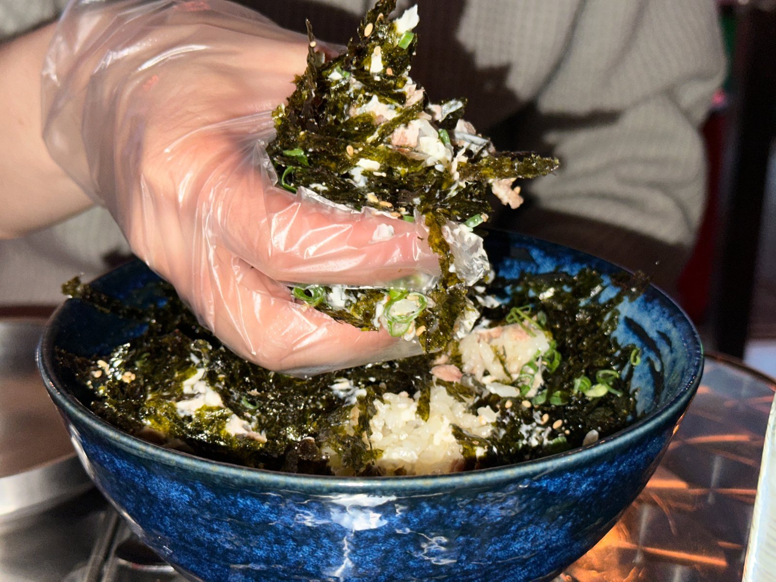 주먹밥 위에 대창 올려서 먹었어요. 이 조합이 진짜 미쳤어요.