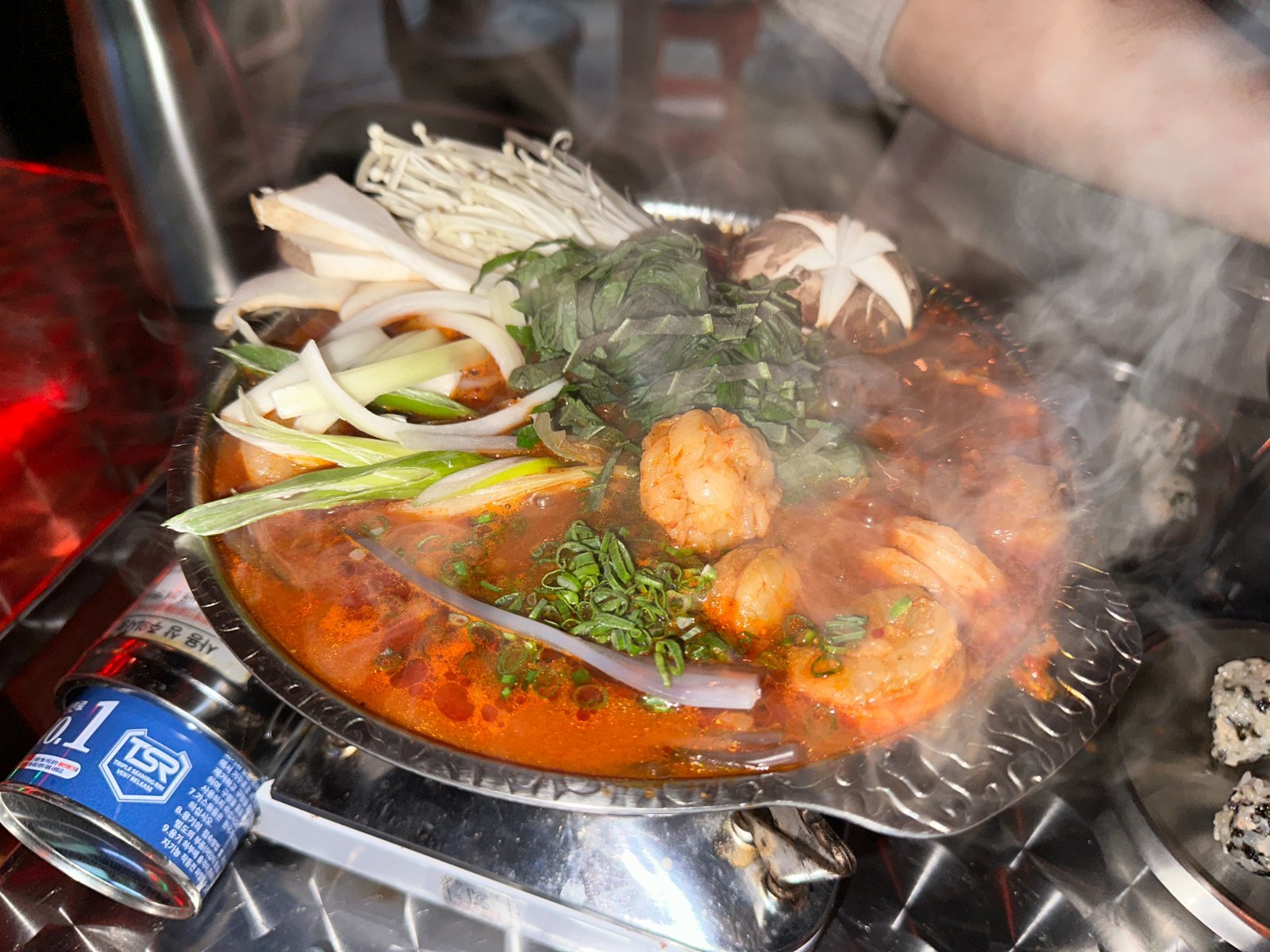 대창전골 끓는 중이에요. 보글보글 끓으니까 군침이 절로 돌았어요.