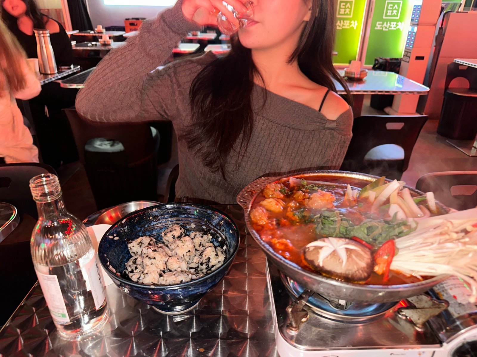 소주 두 병째 들어갔어요. 분위기도 좋고 안주도 맛있으니까 술이 술술 들어가더라고요.